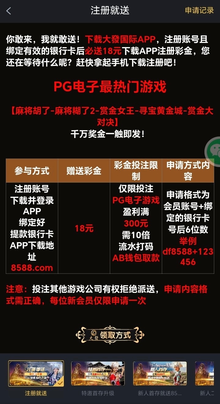 新用户下载APP注册绑定信息优惠里面自助申请18彩金,只能打PG电子 具体自测