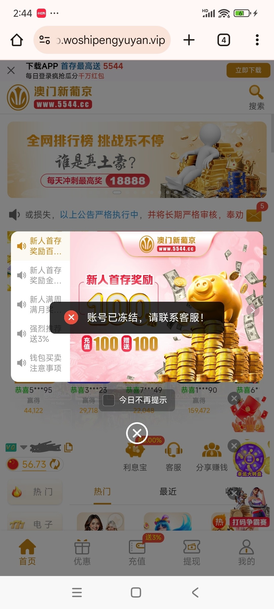上午注册的,刚准备冲100结果封了,封了也好