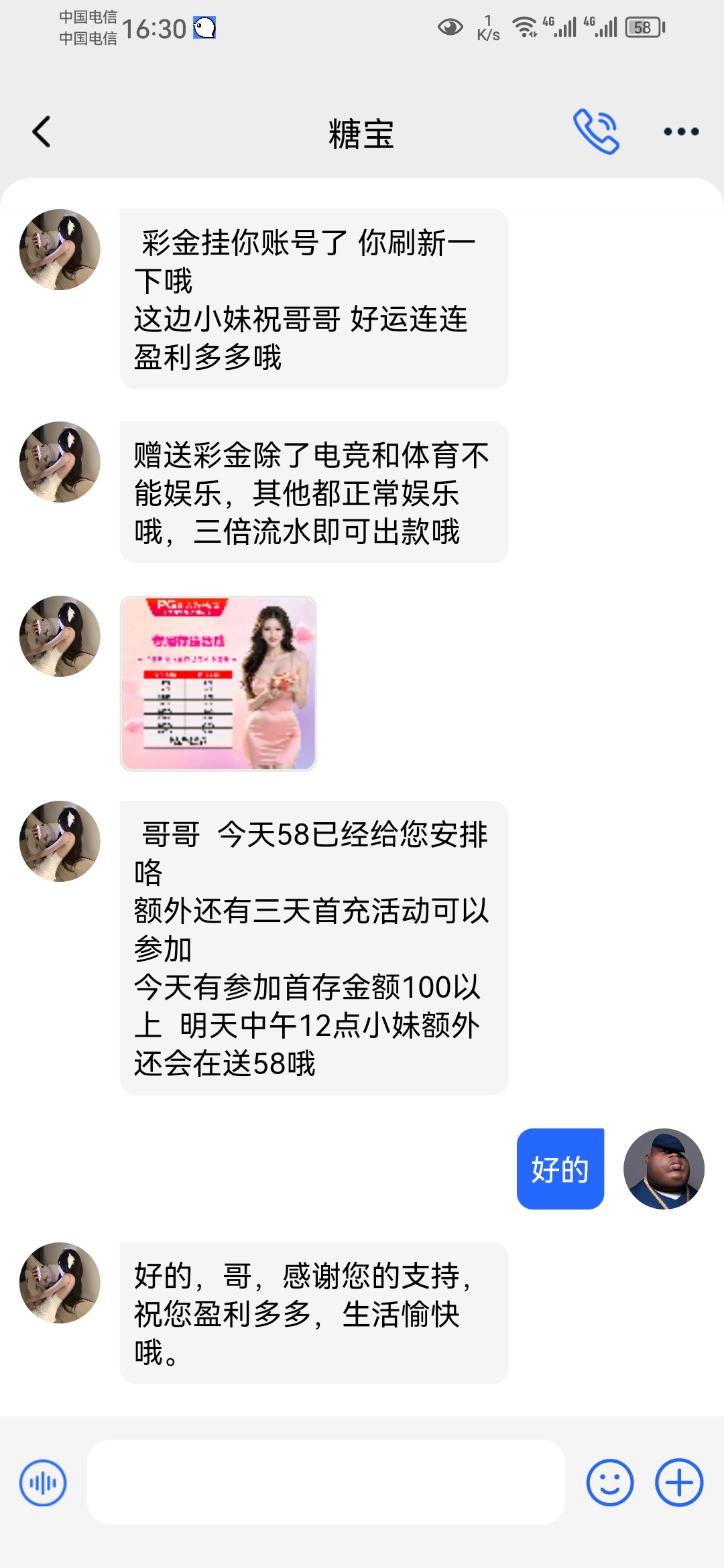 打电话来说送188没有送只有58有号的上去看看没有号的去碰瓷一下找客服说电话彩金就行网址5033.VIP