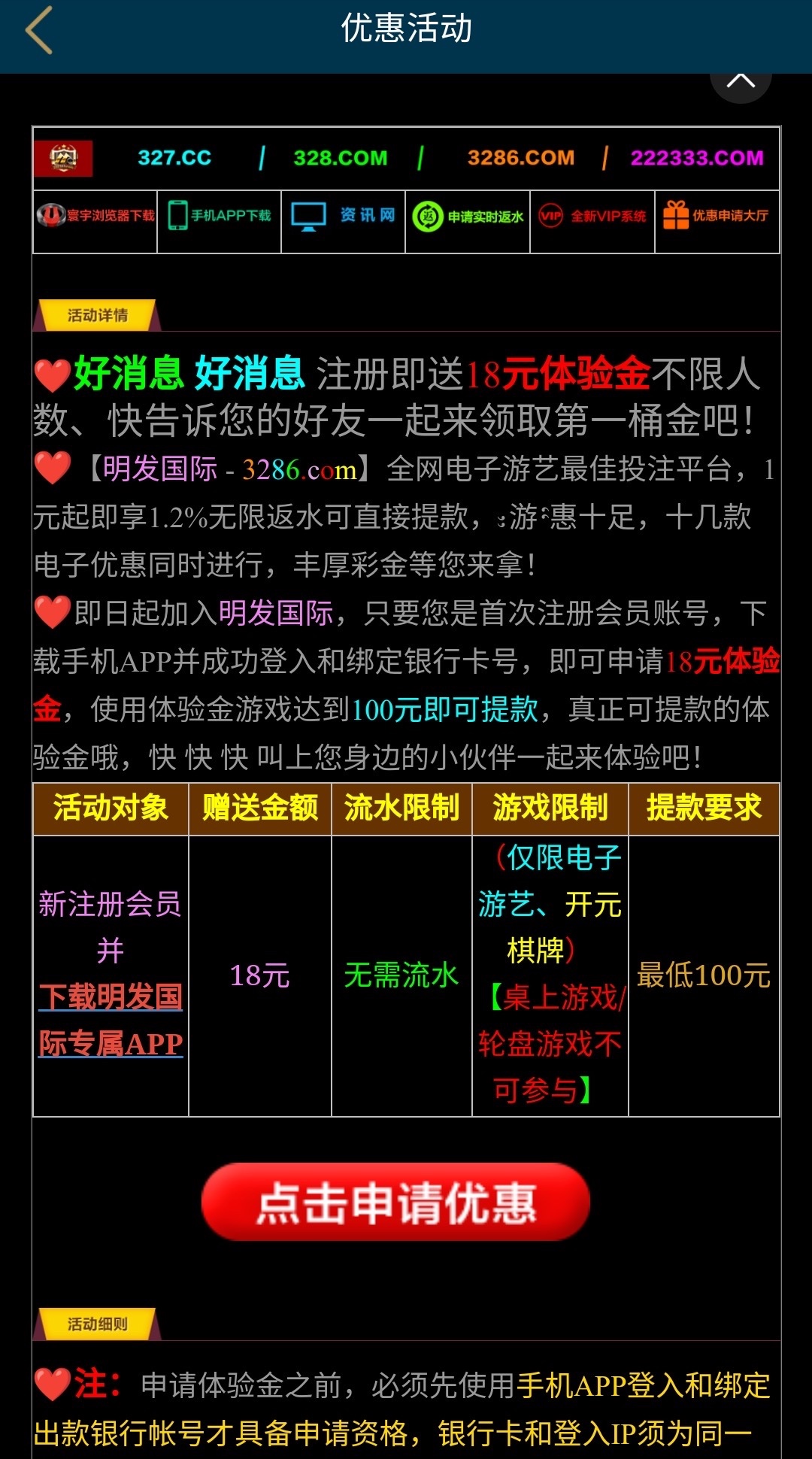 活动:新用户注册完善资料下方链接申请18彩金