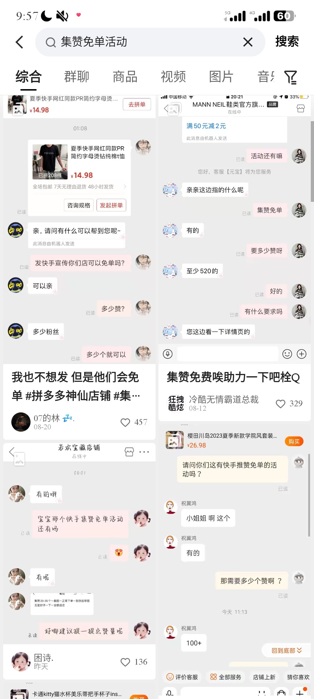 我来解答一下: 就是你去联系拼多多上的商户看上哪样东西 基本价格在几十左右的商品联系客服 跟他们说可以发快手抖音集赞免单吗?可以的话你就把他们的店名聊天记录截图发到快手抖音,有人帮你们点赞到客服要求的点赞量,人家就会给你免单你之前选中的产品