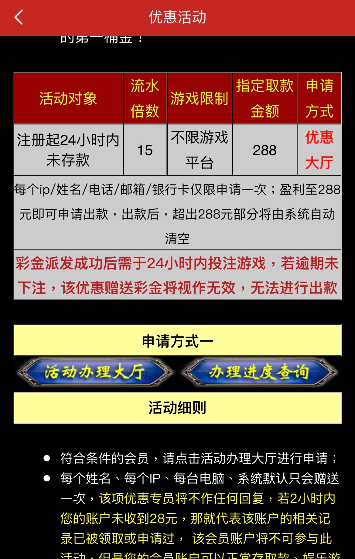 新用户注册绑定银行卡完善个人信息即可前往优惠大厅申请28新人彩金 15倍流水 288提现!!!