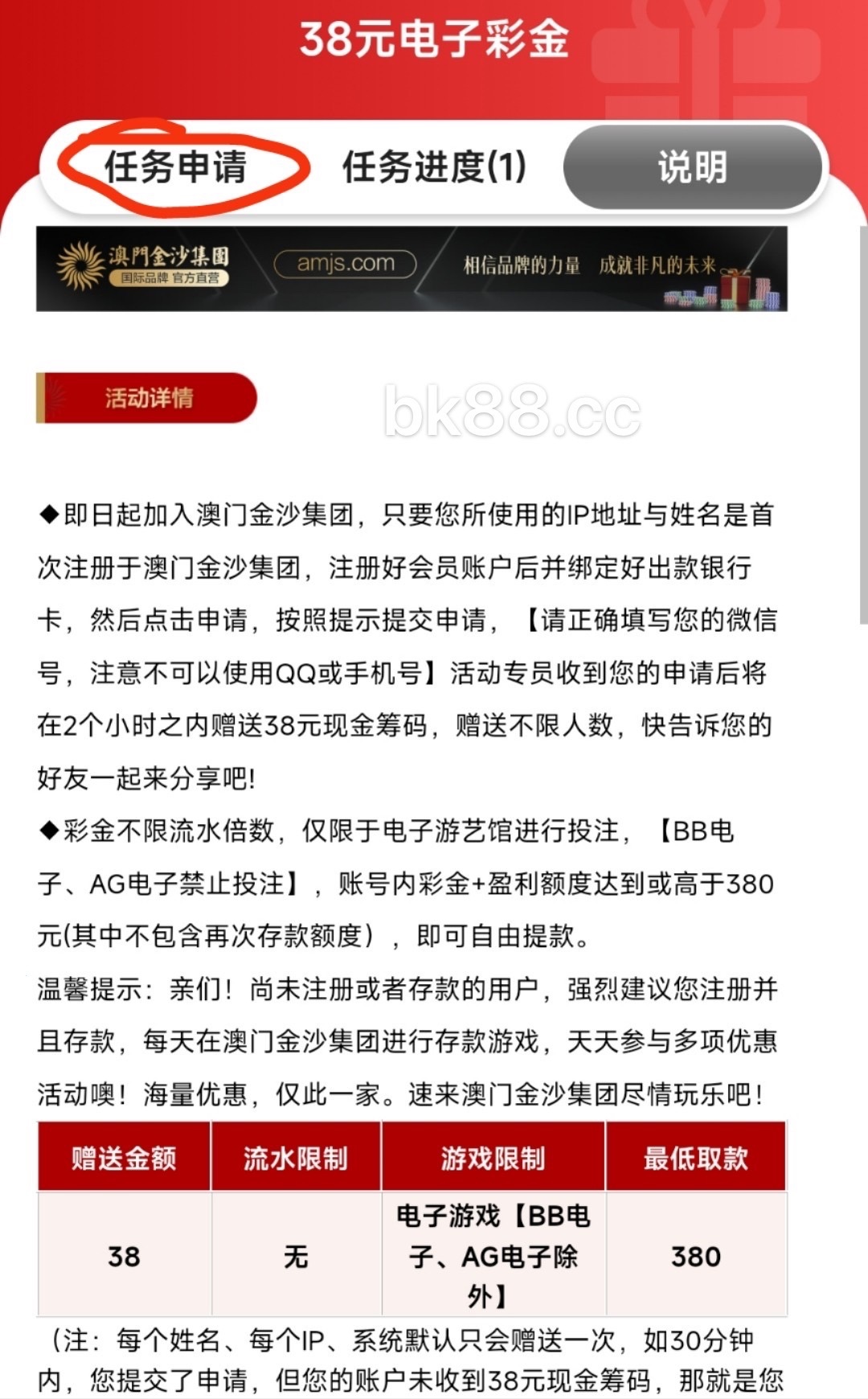 注册好会员账户后并绑定好出款银行卡,然后点击申请,按照提示提交申请,【请正确填写您的微信号,注意不可以使用QQ或手机号】活动专员收到您的申请后将在2个小时之内赠送38元现金筹码