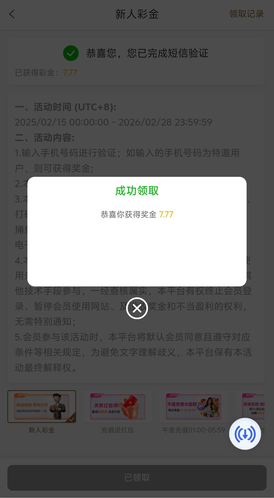 特邀碰瓷:新用户注册完善个人信息完成手机验证平台彩金自动赠送金额不定